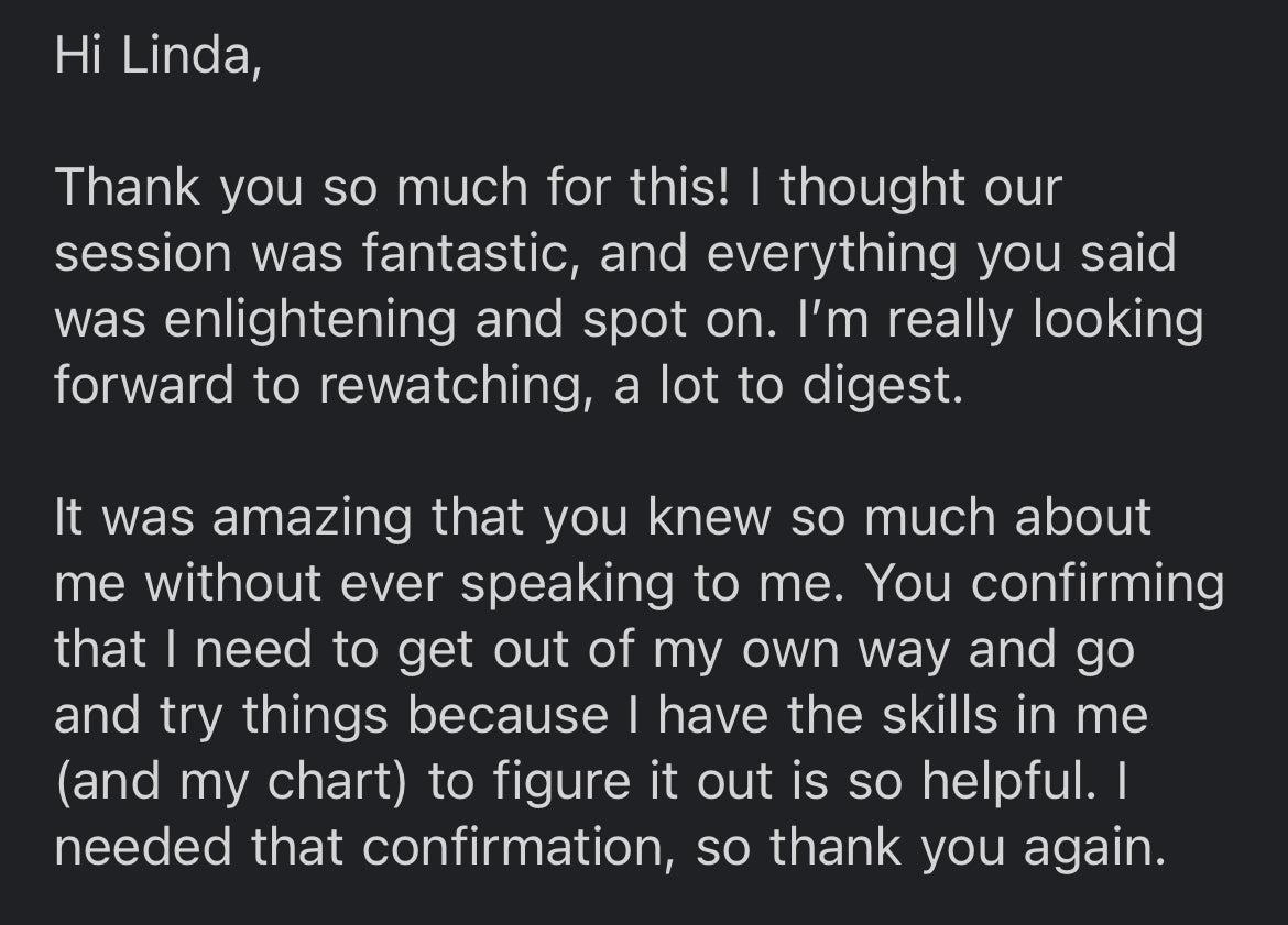 Please note: gift cards cannot be used for these sessions. If you would like to gift a reading, please reach out directly to linda@lindalignment.com to set it up.