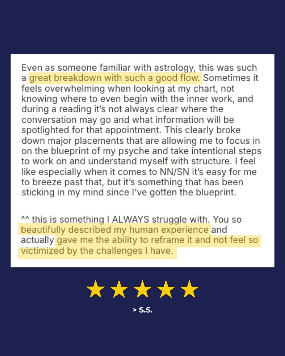 Nope - and that’s the point. This is a focused, emotional deep-dive into 5 key placements. It’s perfect if you want a deeper level of self-understanding without sitting through a 60-minute Zoom call or paying $$$ right off the bat. You’ll get clear insight into your patterns, purpose, emotional wiring, and what’s next.