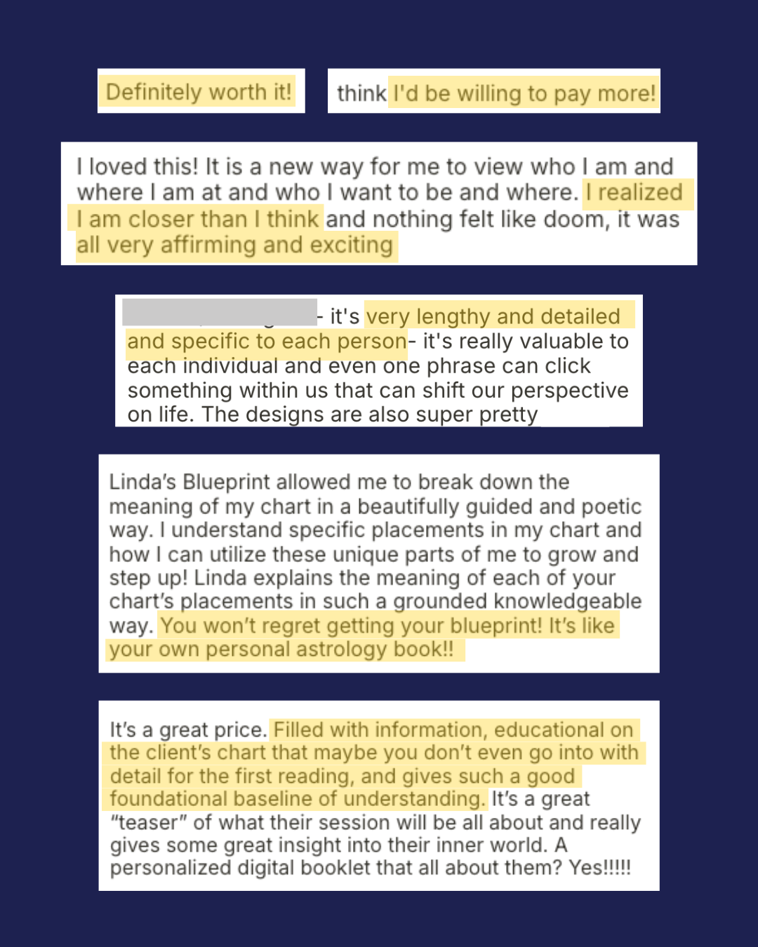 Not even a little, boo! It's my job to translate your chart into language you’ll actually understand - and feel in your body. I promise you will be able to 100% understand everything in your report.