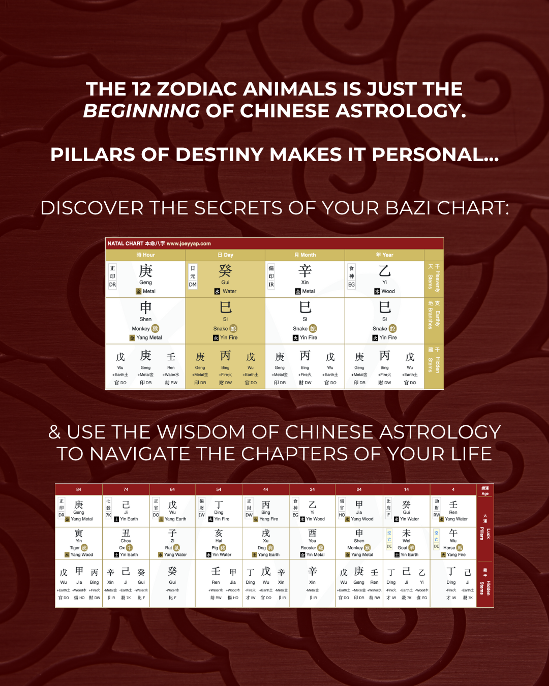 In this self-led journey, you'll tap into the ancient wisdom of Chinese Astrology and uncover the hidden mysteries of your Bazi chart, including: